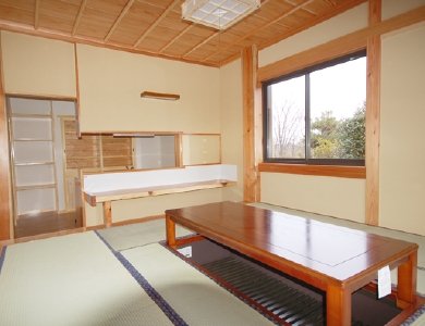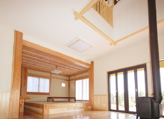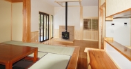 ダイニングには地元の神社の杉を使い、杉の間仕様に。畳床を1尺5寸上げましたので、堀コタツに座ったときに台所と合う目線の高さになり、会話も自然と生まれます。高齢者でも座り上がり座り下りの出来る負担のない高さでもあります。さらに、台所対面キッチンカウンターの椅子にもなるので使い勝手の良いダイニングになりました。