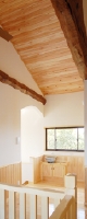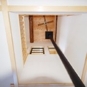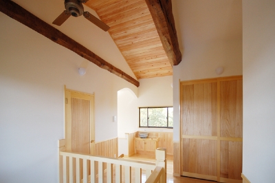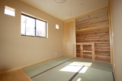 寝室は畳敷きを希望されました。高い位置に小さなフィックス窓を取り付け、外からの視線を気にする事無く太陽光を取り入れられるようにしました。収納は杉板張りにし、湿気のこもらない呼吸の出来る収納です。整理してたっぷり収納できるよう棚も設けています。