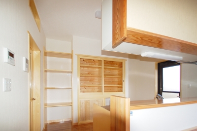 正面には勉強机としても使える多目的カウンターを無垢一枚板で取り付けました。お料理をしながら子供達の勉強の様子を見る事も出来ます。背面にはたっぷり収納できる備え付けの収納と食器棚をスッキリと配置しました。明るくゆったりとした、奥様も大満足のキッチンです。