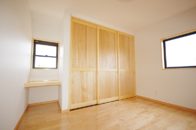 ホルムアルデヒドやシックハウス症候群対策もしっかりとなされた子供部屋。三枚開きで大きなものも簡単に収納できる押入。机代わりにもなる備え付けのカウンターボード。シンプルでありながらも、工夫が沢山盛り込まれています。