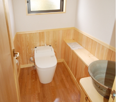 トイレの手洗いボールは、ご主人がご用意した益子焼を使いオリジナルで造作。ご主人の趣味を取り入れる事で、個性溢れるお洒落なトイレができました。サイド壁面にはカウンターを設けましたので、トイレットペーパーのストックや、芳香剤や花瓶などのちょっとした物を置くことができます。汚れが気になる場所でもあるので、板張りの腰壁で仕上げました。