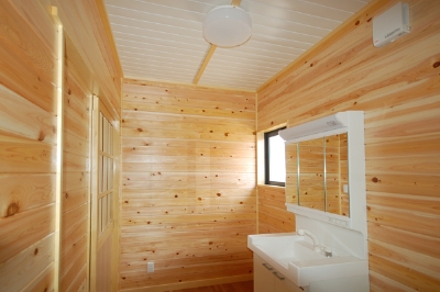 脱衣場は旅館のお風呂を思わせる板張りを標準仕様。湿気対策と、お風呂の雰囲気を両立させています。洗濯・歯磨き・お化粧・脱衣と、日々の生活の中でもとくによく使う場所ですので、広めのスペースを確保しました。