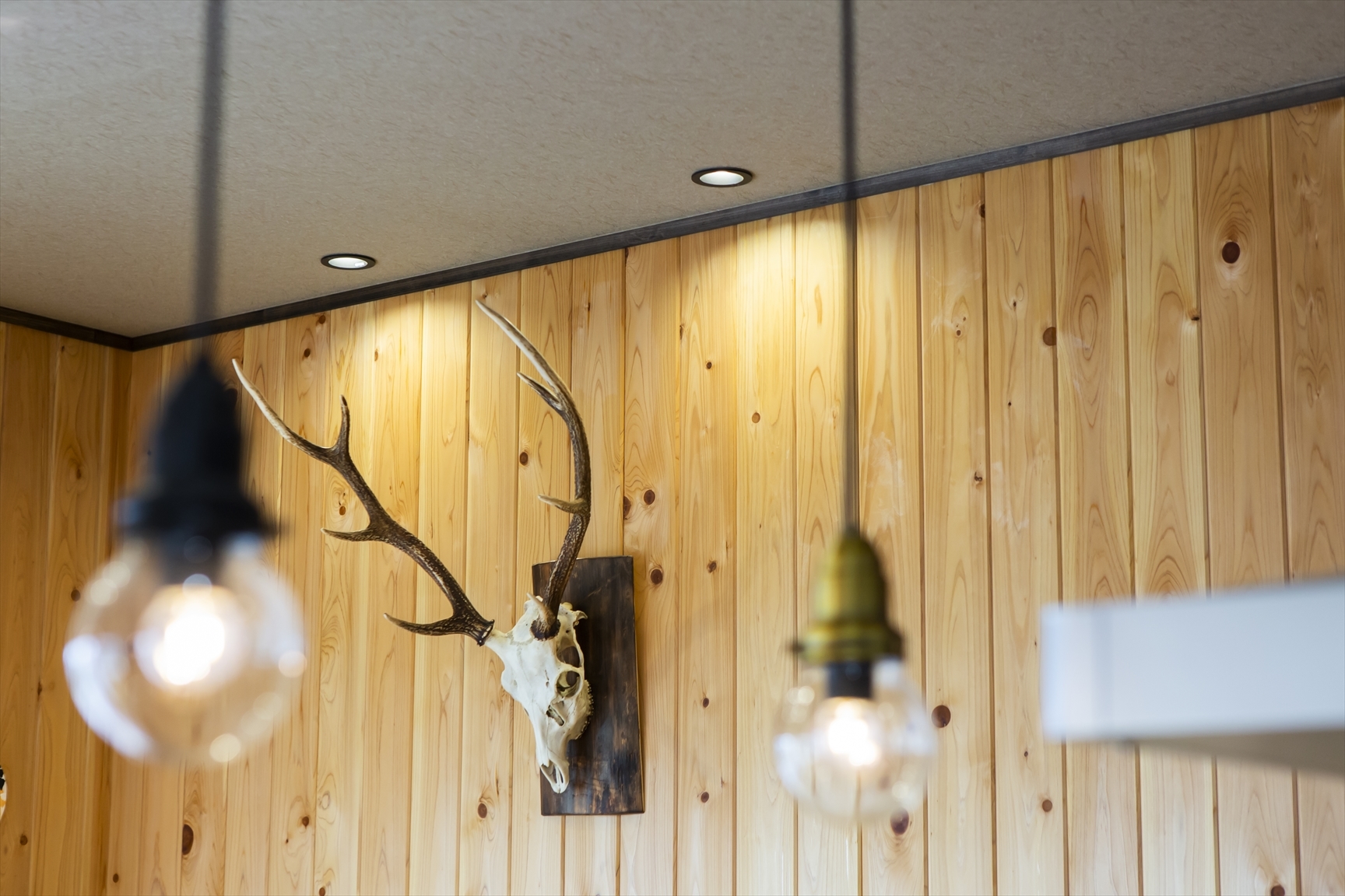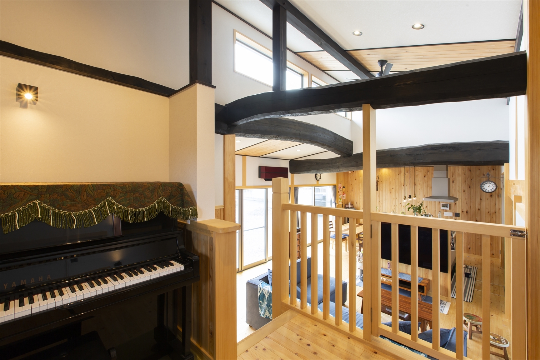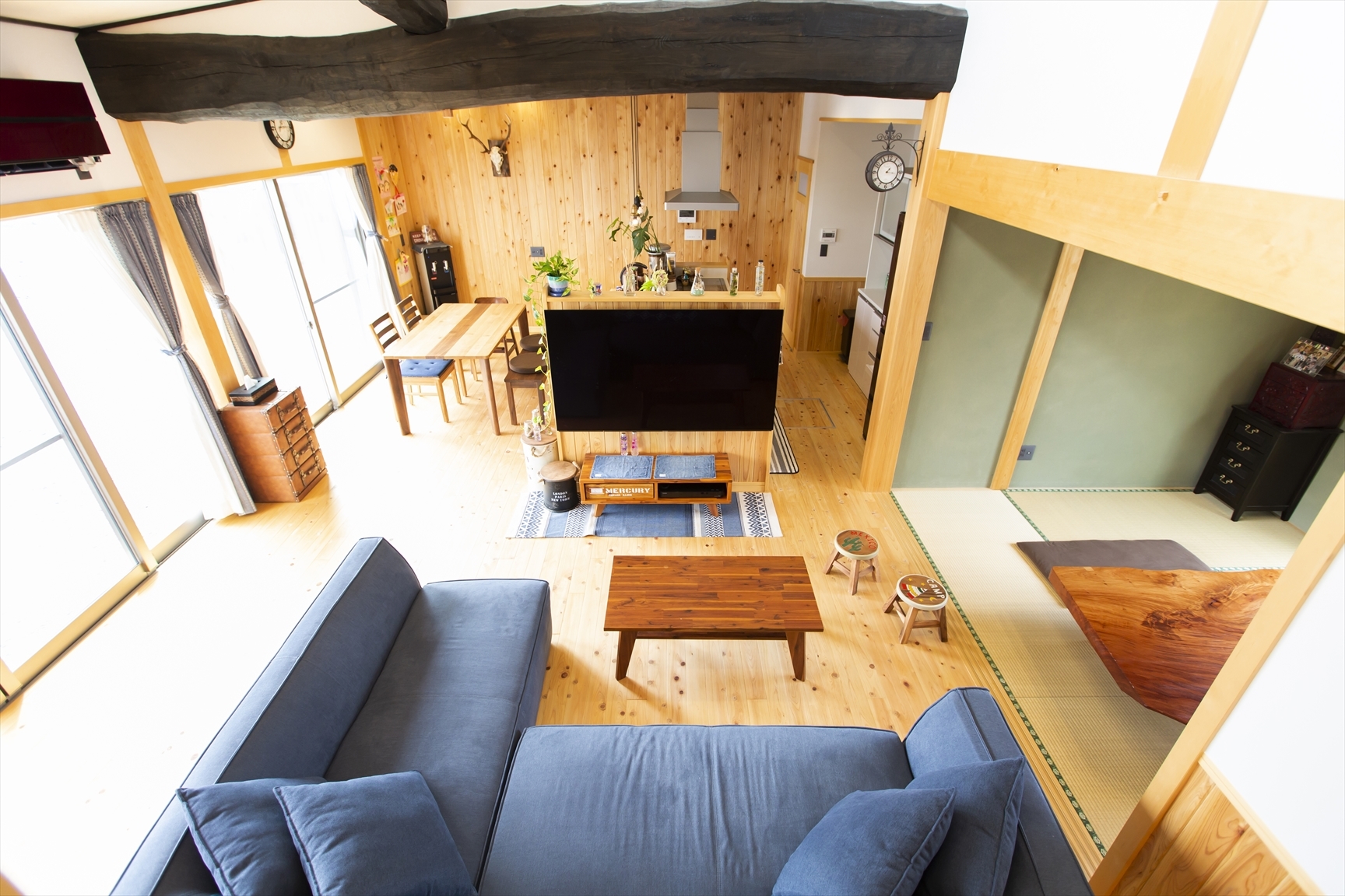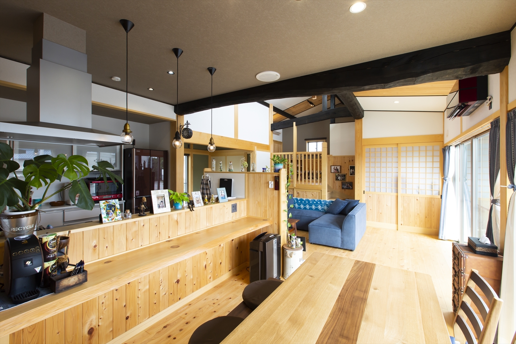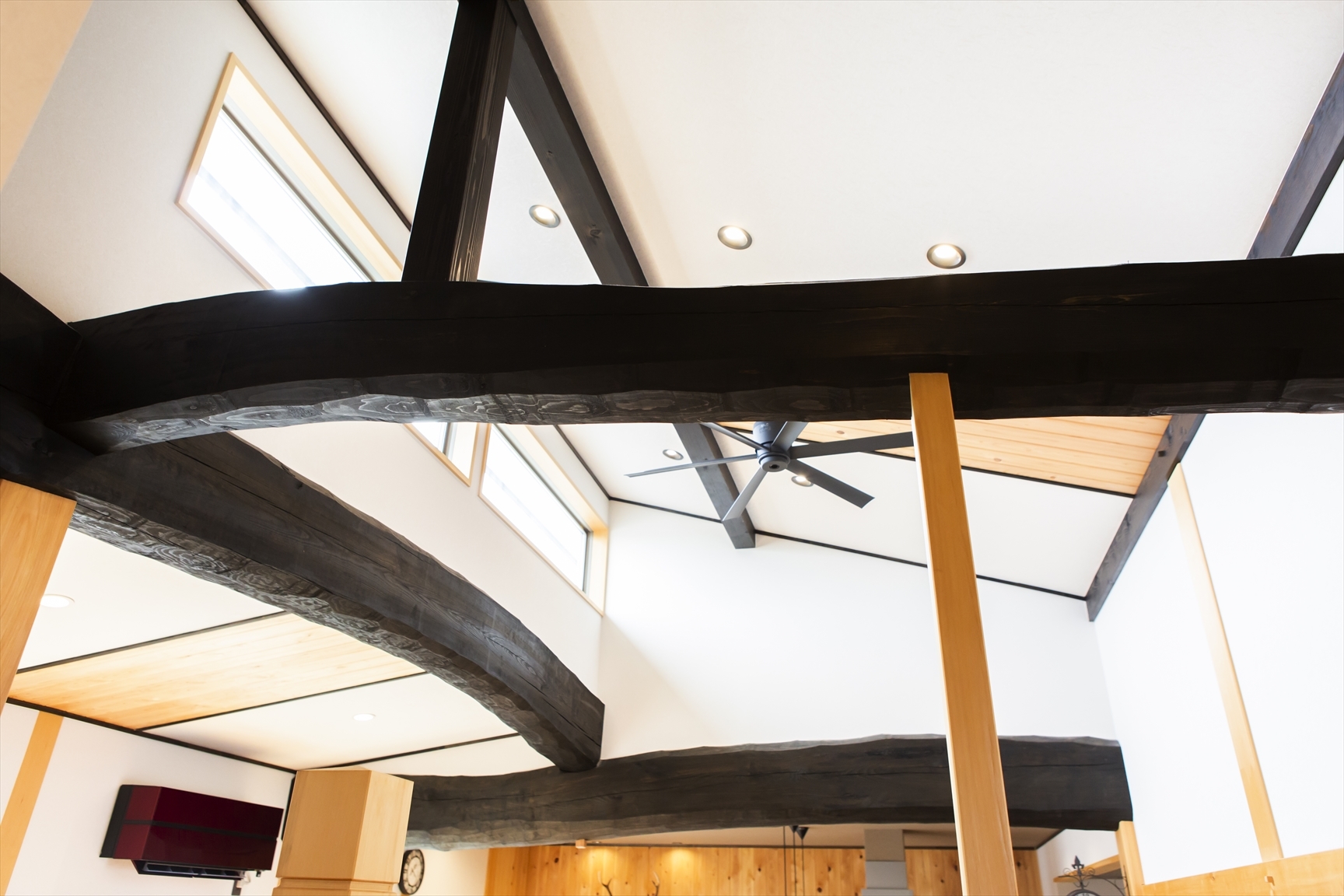 勾配天井と地松の梁が広い空間を演出し、室内の奥まで窓からの明るい陽射しが差し込見ます。
