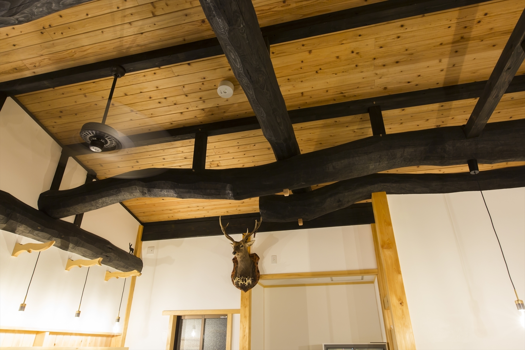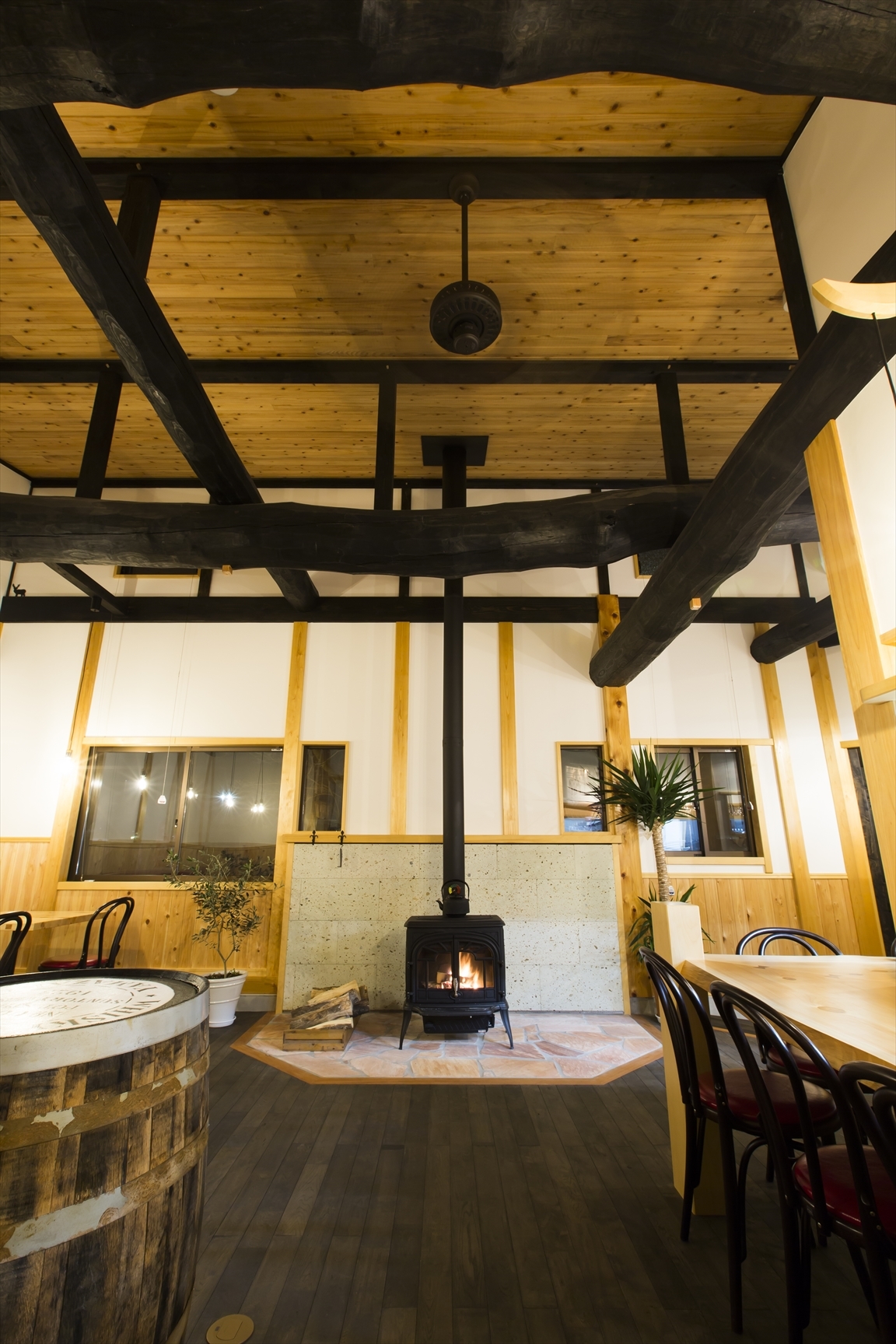 丸太梁を使い広いスペースを確保し、薪ストーブ、アンティーク調照明で