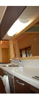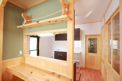 茶の間とと目線も合い、 一体感がある仕様に!対面のカウンターは桧の皮付き、