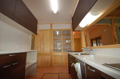 対面キッチンには、食品庫、食器棚、背面調理棚&収納を作りつけ、