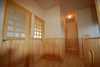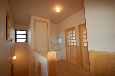 二階廊下にも小さなホールスペースを作り、圧迫感のない使い易いように工夫し、大きな収納も確保、