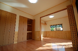 寝室は12畳を二つに割り畳スペースと板の間に分け使い勝手を重視し、子供たちの部屋も各々一工夫しています。