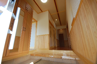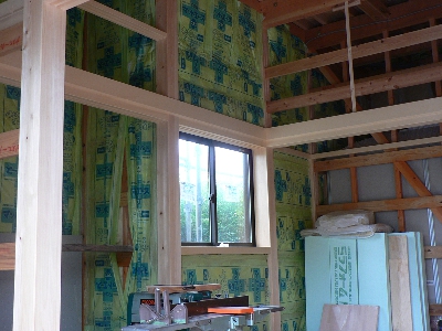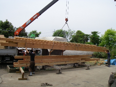 軟弱地盤の為地盤の改良と共に、今回も敷地搬入が可能な為長物を使用、今では非常に少なくなった、先行 貫”(和室壁下地材)工法で、金物だけに頼らず建物の強度を木組みの力で増しています。